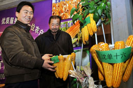 1月9日,來自鹽池縣的馬玉濤(左)向農民朋友介紹:由于正確選用了適合土壤酸堿性的改良玉米種子,2007年糧食畝產接近翻番。