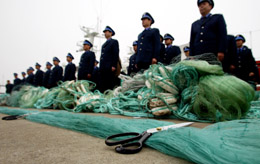 1月10日,農業部東海區漁政漁港監督管理局執法人員在非法流網銷毀儀式上。當日,北太平洋公海非法流網漁具銷毀儀式在中國漁政東?傟牬a頭舉行。據了解,使用非法流網捕魚將嚴重損害海洋生物資源,影響航行安全,侵害合法漁民的利益。