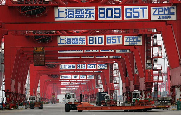 上海洋山深水港的拖車正在進行卸貨作業(2007年10月31日攝)。