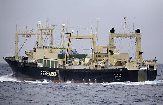 這張1月12日由綠色和平組織“埃斯佩蘭薩”號船只提供的照片顯示的是日本捕鯨船“日新丸”號行駛在南太平洋海域。綠色和平組織14日說,他們兩天前將日本捕鯨船隊的“鯨魚加工”船成功逐出捕鯨區,阻撓了日本在南極洲附近海域的捕鯨活動。