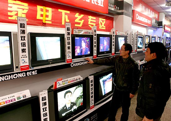 1月15日,四川省華鎣市雙河辦事處昭勛村的農民在“家電下鄉”網點選購彩電。近日,四川省啟動“家電下鄉”試點工作。農民購買補貼范圍內的彩電、冰箱、手機類產品,憑有效證件可到當地的鄉鎮財政所申領“家電下鄉”補貼,標準為家電產品銷售價格的13%。