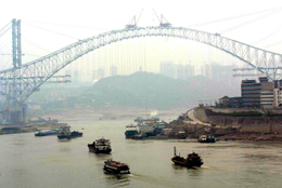 船只正從建設中的重慶朝天門長江大橋下通過(1月17日攝)。朝天門長江大橋為公路軌道交通兩用鋼箱提籃拱特大橋,主拱跨度達552米。目前主體工程完成過半,建設進展順利,該大橋預計在2008年內建成通車。