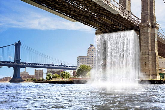 這是丹麥藝術家奧拉維爾·埃利亞松將在美國紐約建起的巨型人工瀑布的模擬圖。據美聯社報道,今年夏季紐約將利用私人捐款,幫助奧拉維爾·埃利亞松利用巨大水泵在布魯克林大橋等建筑物上制造4座人工瀑布。