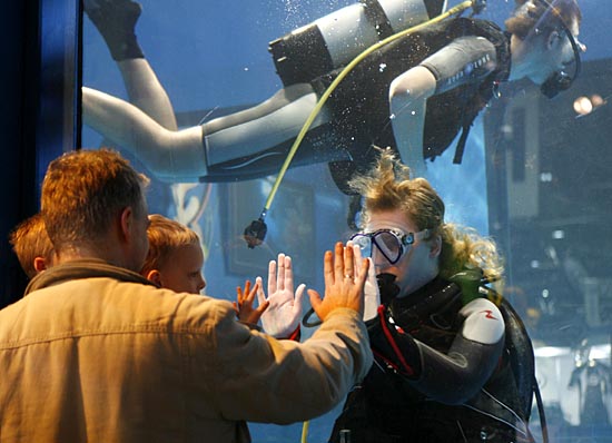 19日,在德國的杜塞爾多夫,參觀者和潛水員隔著玻璃“親密接觸”。第39屆德國(杜塞爾多夫)船艇及水上運動展覽會當天在這里開幕,將于1月27日閉幕。這次活動吸引了來自52個國家和地區的1650家參展商。
