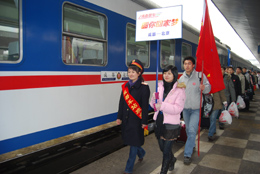 1月21日,搭乘成都至北京西T8次特快列車的118名貧困大學生在鐵路部門工作人員引導下排隊走上月臺。當日,四川40多所高校的500余名貧困大學生免費乘坐列車返回家鄉。