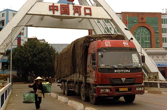 1月21日,一輛中國貨車從中越公路大橋駛往越南。