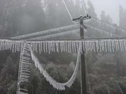 1月27日,高山輸電線路掛滿冰凌。當日,受北方強冷空氣南下影響,福建省長汀縣遭受罕見的冰凍災害,轄區6個鄉鎮高山地帶的輸電線路因覆冰嚴重而損毀,造成約10萬名村民供電中斷。目前電力部門正在加緊搶修。