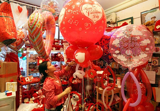 13日,在科威特首都科威特城的一家商店里,售貨員在準備禮品,迎接情人節的到來。