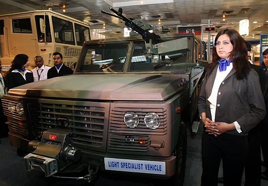 16日,新式戰車在印度首都新德里舉行的軍備展上展出。2008國際國防軍備展當天開幕,來自全球30多個國家和地區的400多家廠商的產品參展。新華社/法新