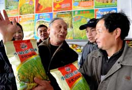 2月17日,福建省建陽市高級農藝師(前左)在指導農民邵良泰(前右)選購稻種。
