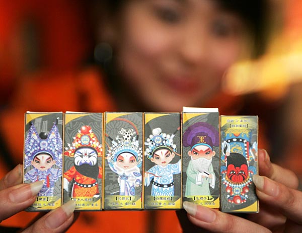 2月13日,在北京一家專營火柴盒的小鋪內,一女孩展示印有京劇臉譜卡通畫的火柴盒。