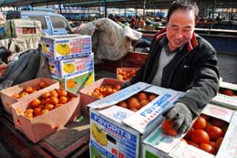 2月18日,寧夏賀蘭縣立崗鎮蔬菜基地菜農馬云愧正在銀川北環蔬菜批發市場銷售西紅柿。