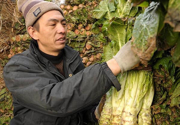 2月19日,一位蔬菜經銷商在整理產自四川的萵筍。當日,新疆最大的蔬菜批發中心——烏魯木齊北園春農產品中心批發市場的各種新鮮蔬菜批發價格比春節前出現了30%至40%回落。