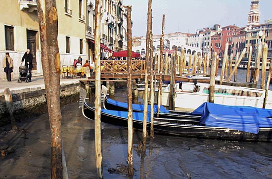 19日,在意大利威尼斯,貢多拉小船?吭诤拥腊哆。威尼斯河道水位18日下降到海平面下80厘米,達到14年來的最低點,許多貢多拉小船都被迫停航。新華社/路透