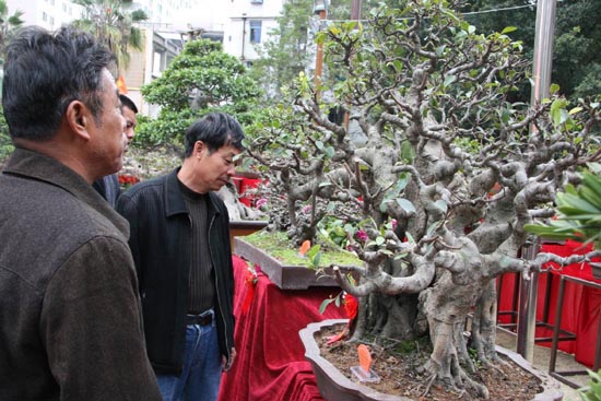 近日,由福建龍海市政府和福建省花卉協會盆景分會共同主辦的福建盆景藝術精品展在龍海市舉辦。來自海峽兩岸的268件盆景藝術作品參展,吸引了廣大市民前來觀賞。圖為市民在參觀獲得金獎的作品《春風化雨》。