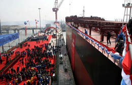 2月28日拍攝的交付儀式現場。當日,民營江蘇熔盛重工集團有限公司制造的萬噸輪“GOLDEN SAGUENAY”交付。這艘冰區加強型散貨船總長225米,型寬32.25米,載重量7.55萬噸,是為挪威一客戶制造的,其各項技術指標均達到或超過設計要求。
