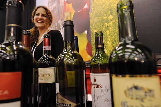 27日,在以色列海濱城市特拉維夫舉行的以色列國際紅酒展上,一名參展者展示葡萄酒。當日,為期3天的以色列第二屆國際紅酒展在特拉維夫的會展中心向公眾開放。