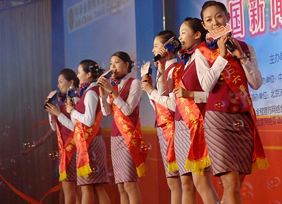 2月27日,南航空姐在演唱選拔賽主題曲。當天,中國南方航空公司招聘空姐新聞發布會在京舉行。據悉,本次招聘工作將從3月開始,預計于今年8月結束。新華社發