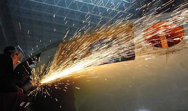 一名建設者在打磨三峽右岸電站19號水輪發電機組的機組頂蓋(3月5日攝)。