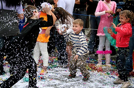 9日,在塞浦路斯南部城市利馬索爾舉行的狂歡節閉幕游行上,幾名兒童相互拋灑紙屑。2月28日開幕的利馬索爾狂歡節當晚落下帷幕。