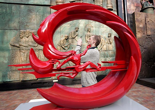 2008奧運景觀雕塑方案征集大賽及國際巡展莫斯科站日前開幕,數十件以2008奧運為主題的雕塑作品與觀眾見面。圖為一名俄羅斯觀眾在莫斯科“采烈捷利藝術畫廊”拍攝參展的奧運題材雕塑作品。