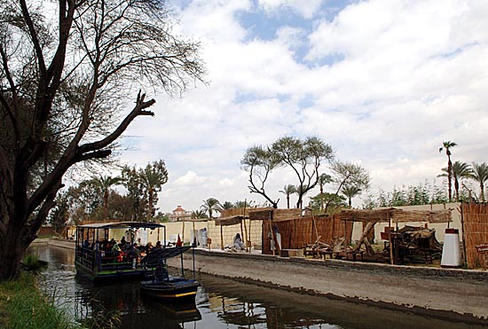 法老村位于開羅市郊尼羅河畔的雅各布島上,占地約200畝,是埃及首任駐華大使哈!だ芳Y修建的。法老村內的主要建筑完全按古埃及樣式建造。400多名“村民”身著法老時代的服飾,使用當時的生產工具,按古埃及人的方式從事農耕、漁獵及手工業制作,展現了幾千年前的古埃及社會生活情景。該景點于1977年正式對外開放,吸引了大批海內外游客前來旅游觀光。
