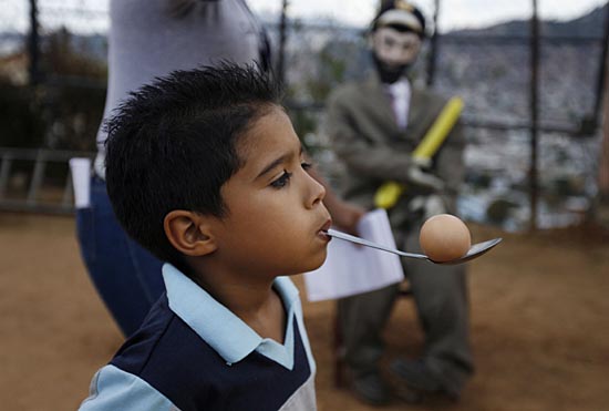23日,在委內瑞拉首都加拉加斯舉行的慶祝復活節的趣味比賽中,一名男孩用嘴叼著勺子運送雞蛋。加拉加斯當天舉行各種趣味比賽慶祝復活節。新華社/路透