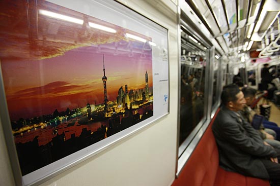 25日,日本東京市民在市內乘坐“上海世博號”列車。當日,四輛裝飾有2010年上海世博會會標和吉祥物圖案的“上海世博號”列車開始在東京四條交通干線上行駛,列車上還展出了1280幅圖片,將在為期一個月的時間里流動展示上海及上海世博會。