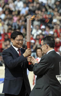 3月30日,中共中央政治局委員、北京市委書記、北京奧組委主席劉淇(左)在雅典1896年首屆現代奧運會主會場從希臘奧委會主席基里亞庫手中接過北京奧運會圣火火炬。當日,北京奧運會圣火交接儀式在雅典1896年首屆現代奧運會會場舉行。