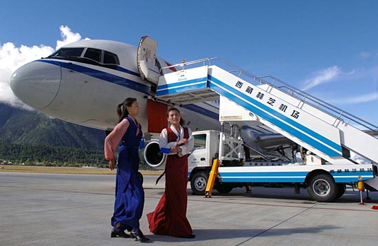 2006年9月1日,兩名藏族少女從停在西藏林芝機場的一架飛機前經過。