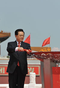 3月31日,中共中央總書記、國家主席胡錦濤出席北京2008年奧運圣火歡迎儀式暨火炬接力啟動儀式。