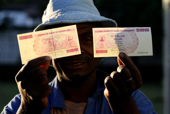 5日,一名津巴布韋人在首都哈拉雷展示新發行的5000萬津元紙幣。津巴布韋中央儲備銀行宣布,從4日起發行當今世界貨幣中面額最大的5000萬津元紙幣,以緩解目前津巴布韋市面上的現金短缺問題。目前津巴布韋的通貨膨脹率達到100000%。