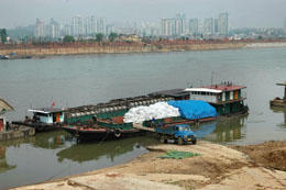 4月9日,貨船在長沙湘江旅客客運碼頭裝卸貨物。
