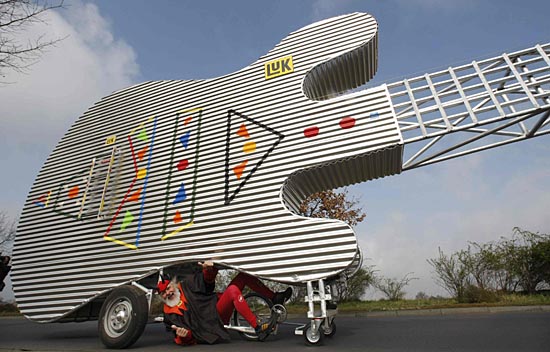 在德國柏林南部的施托爾科,56歲的德國藝術家迪迪·森夫特騎在自制的“吉他自行車”上。這輛“吉他自行車”長12米,高5米。新華社/路透