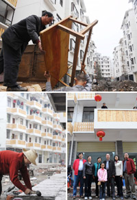 上圖:4月13日,湖北省興山縣高陽鎮一戶移民正在搬家。左下圖:4月13日,高陽鎮一位工匠在鋪設新居門口的地磚。右下圖:4月13日,一戶剛搬進新居的移民在新居前拍下全家福。