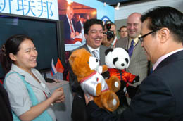 4月15日,一位俄羅斯商人在琶洲展館進口展區向中國客人贈送象征雙方友好的玩具禮物。