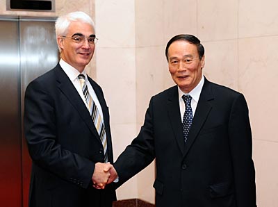 4月15日,首次中英經濟財金對話在北京舉行。國務院總理溫家寶的特別代表、國務院副總理王岐山和英國首相布朗的特別代表、財政大臣達林共同主持對話,兩國經濟、財政、金融、貿易、外交等部門負責人與會。這是對話開始前,王岐山與達林握手。