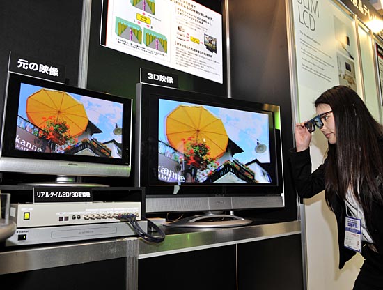 16日,在日本首都東京舉行的日本平板顯示器展上,一名JVC公司的職員展示該公司的實時3D立體影像轉換系統。畫面左側為原始圖像,右側是經過轉換后的3D立體影像,使用者只需戴上特殊眼鏡便能實時看到逼真的立體影像。新華社/法新