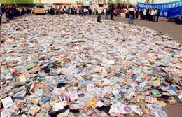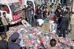 4月20日,大量盜版音像制品即將被銷毀。當日,吉林省舉行集中銷毀侵權盜版及非法出版物活動,從省內各地收繳來的90萬余件盜版及非法出版的圖書報刊、音像制品等被集中銷毀。 |