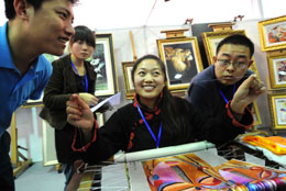 4月18日,一位繡品參展商向參會者介紹繡品特點。當日,天津第十五屆投資貿易洽談會拉開帷幕。