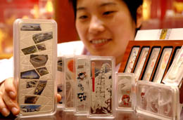 4月22日,北京菜百商場的工作人員展示奧運彩色銀條。當日,由北京奧組會授權、中國金幣總公司發行的奧運彩色銀條在北京、上海、廣州等地同步發售。這套奧運彩色銀條共有7種規格,涵蓋了會徽、場館、吉祥物、開幕式、圣火傳遞等重要奧運標識及標志性事件。