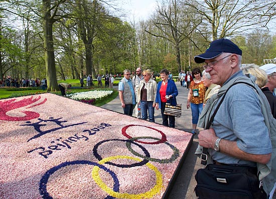 23日,在荷蘭利瑟鎮的庫肯霍夫郁金香公園內,游客在欣賞用花瓣拼成的“BEIJING 2008”圖案。近日,庫肯霍夫郁金香公園將中國和北京奧運作為今年的活動主題,園內的各種花卉和裝飾都體現著中華文化的神韻和奧運精神。