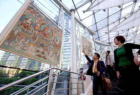 4月23日,觀眾在位于北京中關村的清華科技園陽光廳觀看敦煌石窟壁畫臨摹作品。當日,主題為“盛世和光啟迪創新”的敦煌石窟藝術展在北京拉開帷幕,展出了十幾幅由敦煌研究院美術研究所畫家牛玉生臨摹的敦煌石窟精美壁畫。