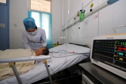 4月28日,一名危重患兒在阜陽市第二人民醫院重癥監護室接受治療。