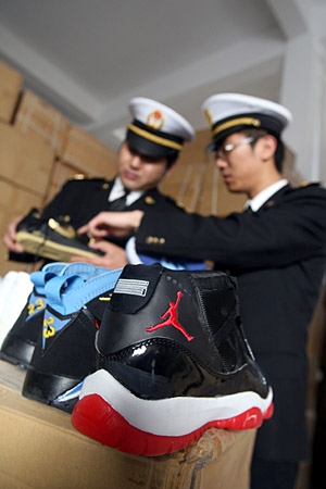 寧波海關日前對被控的四個集裝箱同時進行突擊查驗,一舉查獲假冒“NIKE”和“飛人喬丹JORDAN(圖形)”商標運動鞋四個整柜,共計39360雙,按照正品價格計算,貨值約3000萬元人民幣。