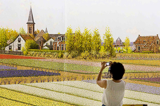 7日,在荷蘭西部的沃爾豪特,參觀者拍攝荷蘭畫家萊奧·范登恩德所繪的《全景郁金香花田》。范登恩德自1997年起,每年春天都會花費10個星期時間創作他的巨幅郁金香畫作。畫作長63米,高4米,其中描繪了超過100萬朵郁金香。新華社/法新