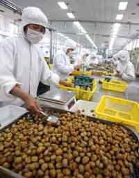 5月10日,河北遵化栗源食品職工在車間緊張工作。河北栗源集團199年引進國際先進設備,進行板栗儲藏與深加工,科學管理發展迅速,目前年加工能力達2萬噸。據介紹資料表明,預計年可實現產值3億元,創匯3000萬美元。栗源集團2004年獲得日本有機食品認證,2007年通過歐盟BCS有機食品認證,在國內先后被授予“農業產業化國家龍頭企業”“國家星火計劃外向型企業”“全國工業旅游示范點”“河北省科技企業”等榮譽稱號。