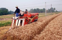 5月26日,安徽蕪湖縣合心村竹元拐農機作業合作社成員駕著收割機為農民收割小麥。 夏收夏種季節,安徽蕪湖縣合心村竹元拐農機作業合作社組成助耕服務隊,每天出動近20臺拖拉機、收割機和插秧機,為農民開展機收小麥、機耕打田和機插秧訂單服務,以減輕農民勞動強度,提高夏收夏種進度。