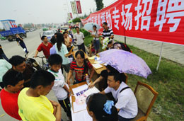 5月27日,四川省綿竹市勞動和社會保障局在受災群眾居住點舉辦“情系災區”就業援助專場招聘會。成都、德陽和來自廣東、甘肅等地的10多家企業為受災群眾提供了1100個就業崗位。有關方面希望更多的企業能夠到災區招聘,為受災群眾提供更多的就業崗位。