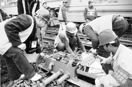 武襄鐵路地處湖北省西北部,連接陜西、重慶、河南三。ㄊ校,為配合國家的中部崛起戰略的實施,目前正加緊改建擴容。圖為中鐵四局電氣化公司員工在進行信號施工。